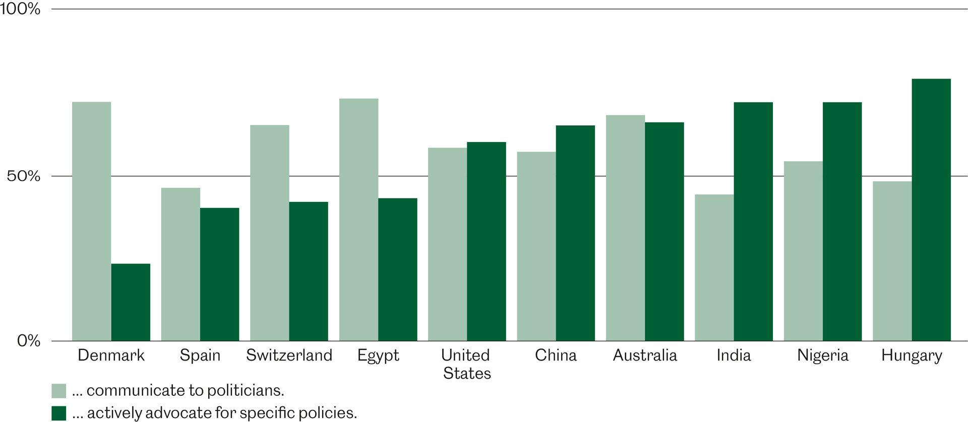 Most European countries, like Switzerland, are for communication, but not very favourable towards scientists engaging in active political advocacy. Denmark is even rather hostile to it, with only 23 percent in agreement. Whereas Egypt ranks on the level of the European countries, Hungary forms a notable exception, for 79 percent of people there are in favour of “active advocacy”. This enthusiasm is shared by the rest of the world, from America to Oceania, through Africa and Asia. “These results are interesting and call for further analysis”, says Bertsou.