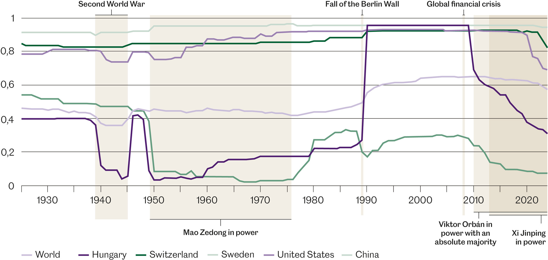 The global geopolitical upheavals of a time are directly reflected in academic freedom. Hungary illustrates this correlation well: its academic freedom tracks the Second World War, the authoritarian regime of the Eastern Bloc, the fall of the Berlin Wall, and now the slide into a new authoritarian regime since the beginning of Viktor Orbán’s second term with an absolute majority. Globally, the index has been in continued decline since the economic crisis of 2008. The index has been calculated yearly since 2022 and has been extended retroactively to 1900.