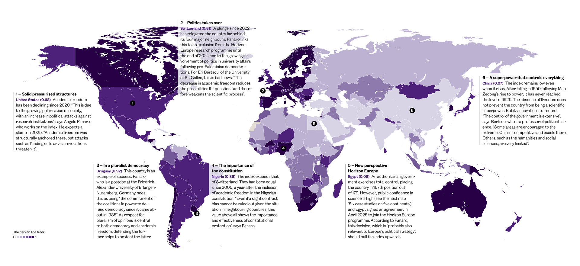 - Six countries and six reasons for a high or low score in the academic freedom index. | Source: The mapping tools and dataset (v15) of the international research project ‘The Varieties of Democracy’ (V-Dem)